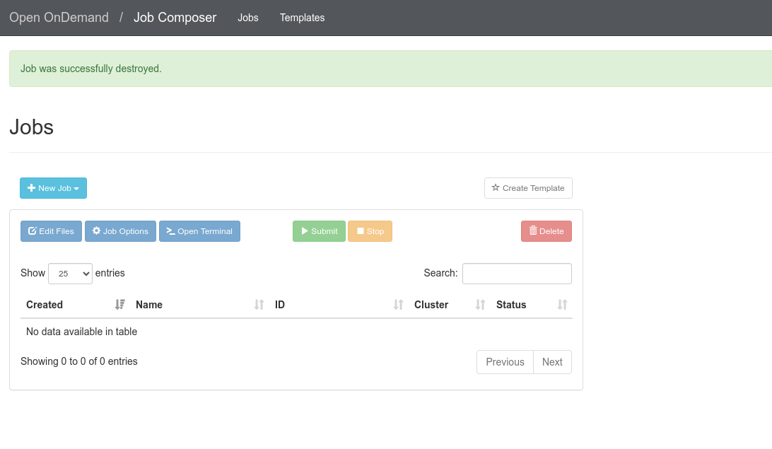 In the main column, a list of your current projects/jobs, consisting of job scripts and output files, initially empty